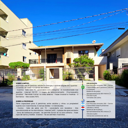 Casa confortável localizada no bairro Centro de Bombinhas, com fácil acesso aos principais pontos turísticos da cidade. Perfeita para famílias ou grupos, acomoda até 8 pessoas entre adultos e crianças, com quartos climatizados e todos os itens necessários para uma estadia prática e relaxante. Aceitamos pets!