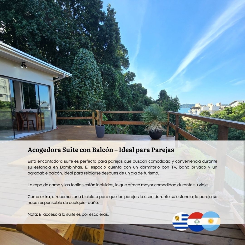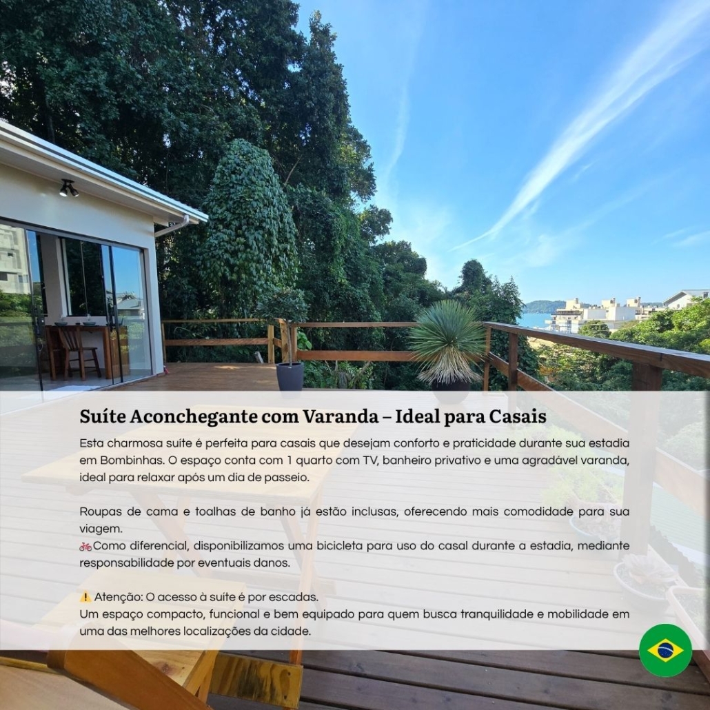 Esta charmosa suíte é perfeita para casais que buscam conforto e praticidade durante a estadia em Bombinhas. Localizada em uma área estratégica, oferece um ambiente compacto, funcional e acolhedor – ideal para descansar após um dia de passeio.