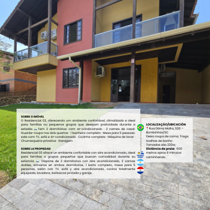 O Residencial 03 oferece um ambiente confortável, climatizado e ideal para famílias ou pequenos grupos que buscam praticidade durante a estadia. O imóvel conta com 2 dormitórios climatizados, sala aconchegante, cozinha completa e churrasqueira privativa, garantindo comodidade e bem-estar para seus dias em Bombinhas. Acomoda até 5 pessoas e possui 1 vaga de garagem.