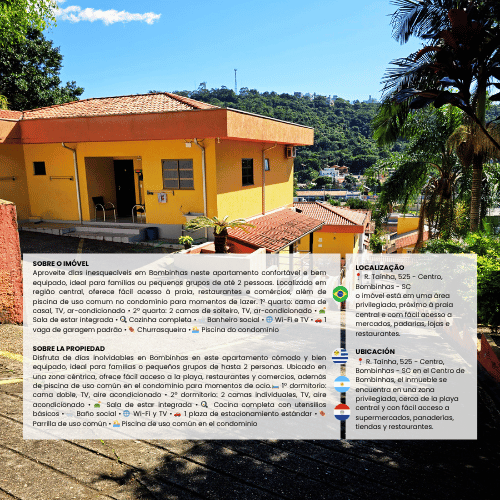 Situado na Rua Taínha, no Centro de Bombinhas, o imóvel está em uma área privilegiada, próxima à praia central e com fácil acesso a mercados, padarias, lojas e restaurantes.