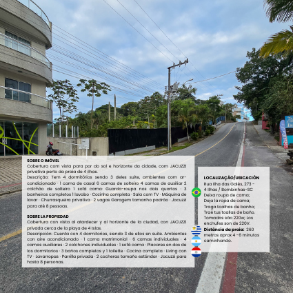 - Comodidades: Ar condicionado na sala, Ar condicionado no quarto, Bairro de Bombas, Banheiro no quarto, Banheiro Social, Berço, Cama Casal, Cama Queen–Size, Casa, Colchão Adicional Solteiro, Cozinha Completa, Estacionamento Coberto, Estacionamento Descoberto, Internet, Kit Praia, Lavabo, Máquina de Lavar, Microondas, Ótima Localização, Perto de Pontos Turísticos, Pet friendly, Roupa de Cama Básica, Smart TV, Sofá Cama, Tranquilidade e Natureza, TV comum, Varanda, Wi-Fi